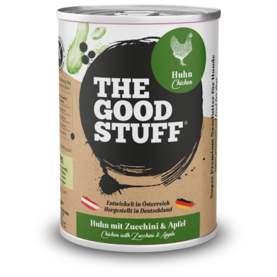 70% Huhn (Fleisch, Herz, Leber, Magen), Brühe, 4% Zucchini, Mineralstoffe, 0,5% Apfel, 0,2% Leinöl, Bockshornklee, Löwenzahn, Flohsamen, Spinat, 0,1% Rosmarin