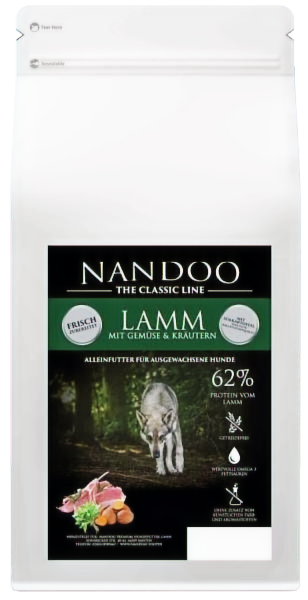50% Lamm: (30% frisch zubereitetes Lamm, 18% getrocknetes Lamm, 2% Lammbrühe), 23% vitaminreiche Süßkartoffel, Erbsen (9%), Kartoffeln, Erbsenprotein, Leinsamen, Rübenschnitzel (entzuckert), Omega 3 Zusatz, Mineralien, Minze (0,2%), FOS (96 mg/kg), MOS (24 mg/kg).